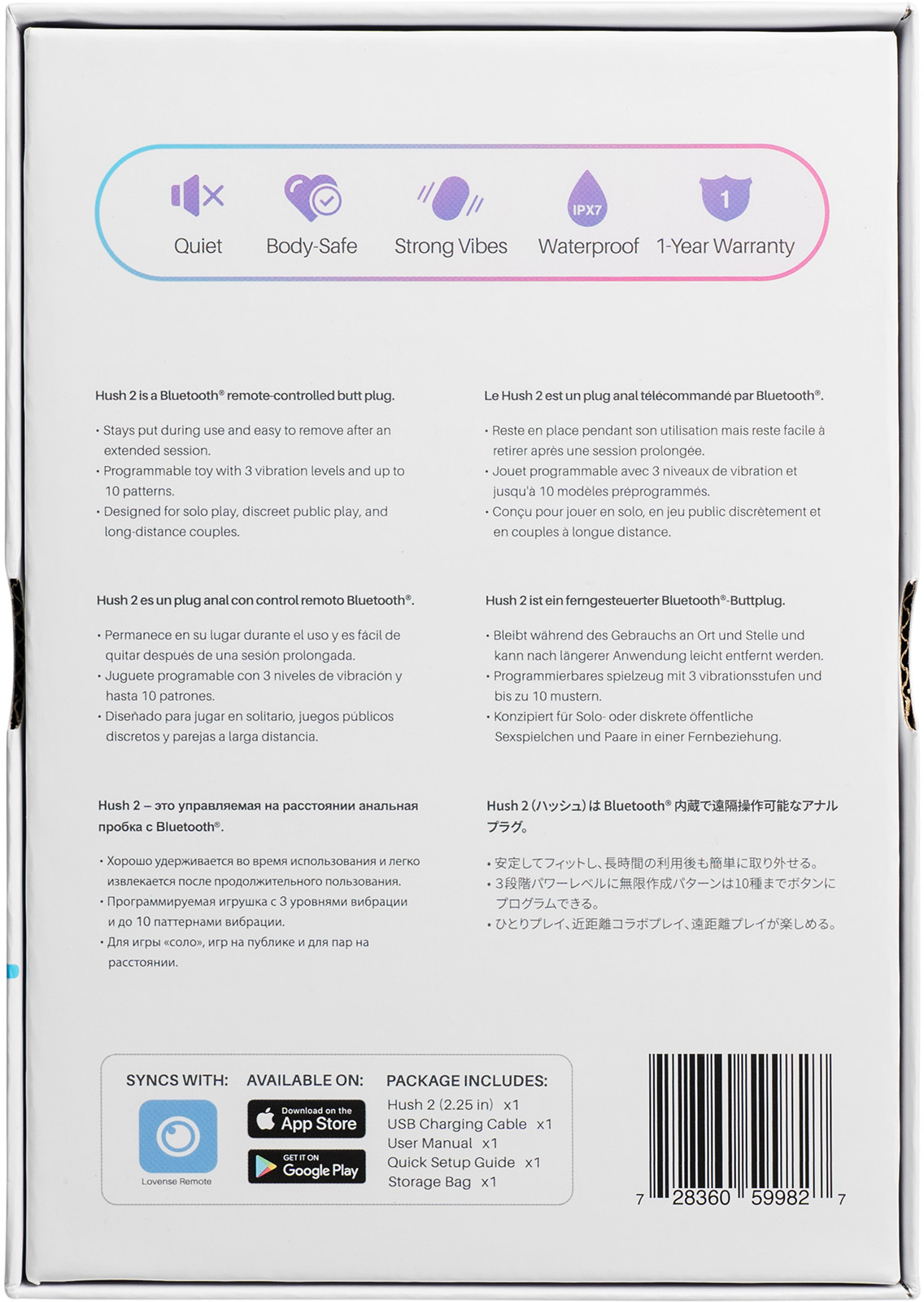 Lovense Hush 2 — это управляемая на расстоянии анальная пробка с Bluetooth. Размер M идеально подойдет для уверенных пользователей анальных практик. Полностью гладкое и бесшовное покрытие из медицинского силикона идеально подходит даже для длительного ношения,- просто выберите нужный вам уровень вибрации: низкий, средний или высокий, и наслаждайтесь ощущениями до 8-ми часов непрерывно. Шелковистый материал, узкий кончик и плавная форма обеспечивают комфортное введение, а выпуклая форма идеально соответствует естественной анатомии анального отверстия. Узкая ножка и широкий ограничитель гарантируют безопасность использования.