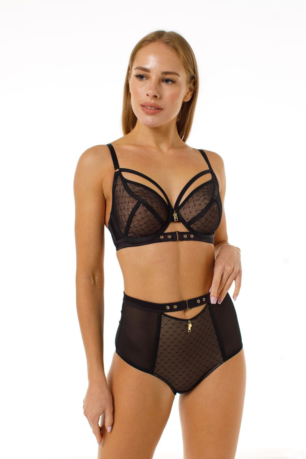Бюстгальтер мягкая чашка на каркасах со стрепами. Выполнен из эластичной сетки. Для поддержания формы груди внутренняя поверхность чашки дублирована неэластичной сеткой. Бретели регулируемые несъемные, стрепы несъемные. Украшение: медальон с логотипом COQUETTE REVUE.