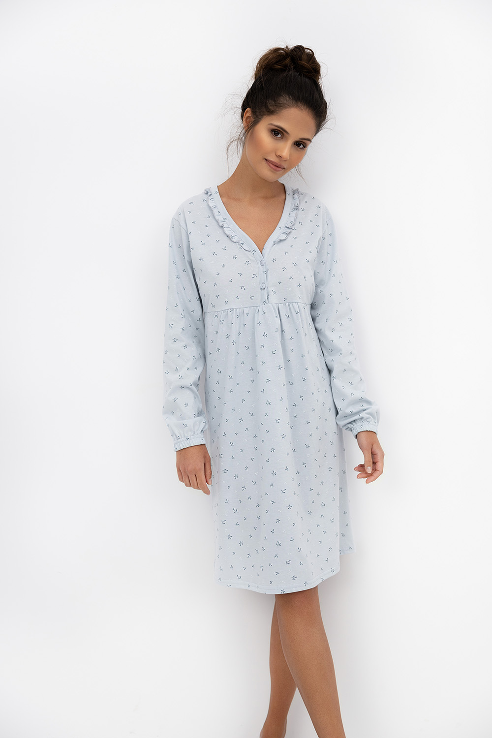 Очаровательное домашнее платье Lucille нежного небесного оттенка. Воротник с v-образным вырезом, с рюшами, на кулиске. Рукава оформлены манжетами. Идеально подойдет не только для сна, но и для отдыха в домашней обстановке.