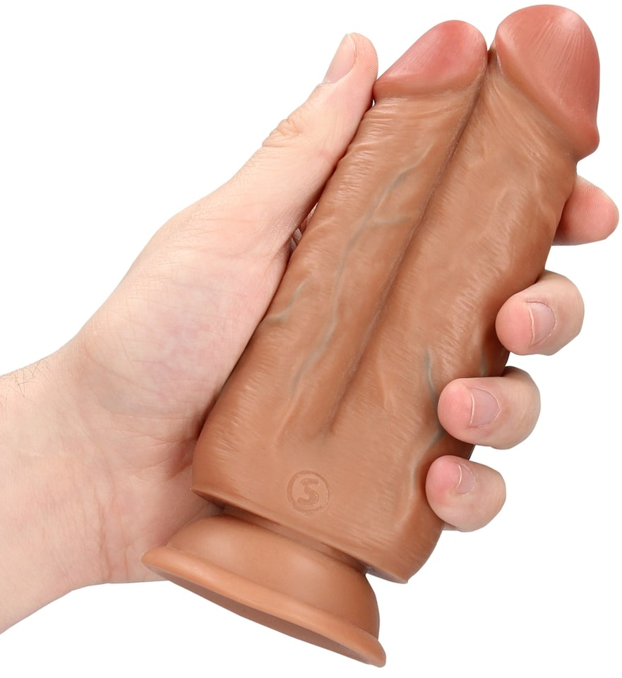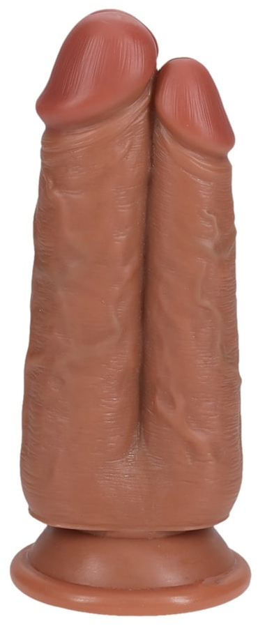 Двойной реалистичный фаллоимитатор с двумя ярко выраженными округлыми головками, рельефным покрытым венками телом для имитации двойного вагинального проникновения.