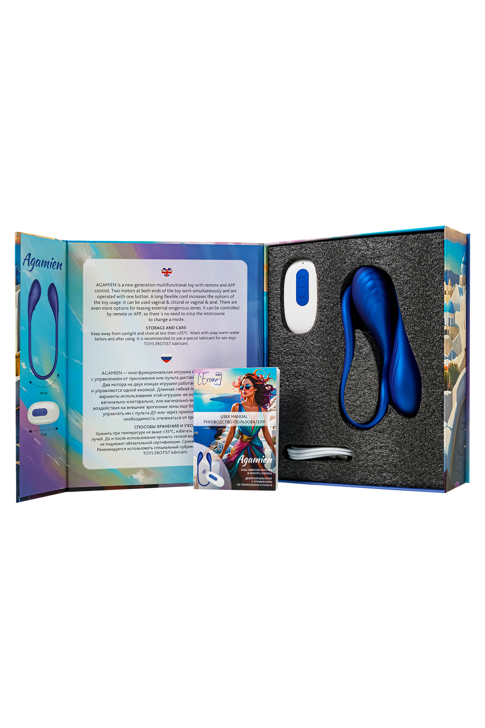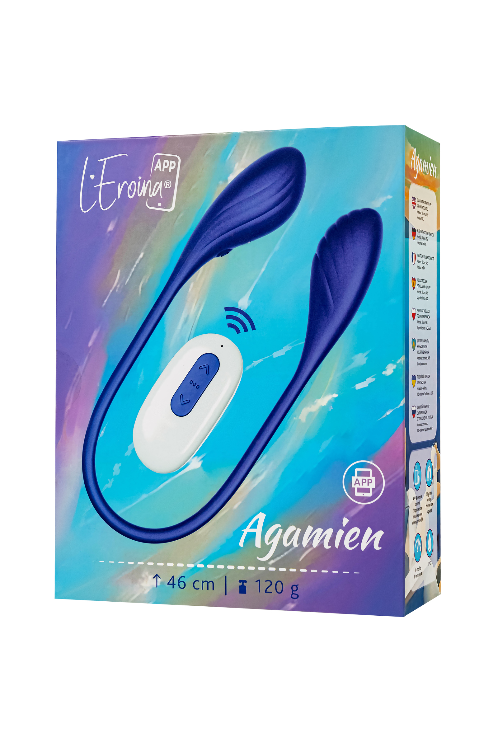 Agamien от L’Eroina — это твой билет в мир фантазий и нескончаемых удовольствий. Представь себе игрушку, которая подстраивается под твои самые смелые желания. Два мощных моторчика на концах, соединенных гибкой перемычкой, готовы доставить тебе незабываемые ощущения, где бы ты ни находилась. Ты можешь использовать её как захочешь: вагинально-клиторально или вагинально-анально, а может, придумаешь что-то свое? Всё зависит только от твоего воображения!Нежный синий металлик — это не просто цвет, это стиль, это то, что подчеркивает твою смелость и желание экспериментировать. Agamien станет твоим тайным спутником в самых неожиданных местах, ведь с его гибкостью и длиной у тебя безграничные возможности. Два моторчика работают синхронно, посылая тебе волны вибрации, которые буквально сводят с ума.Ты можешь управлять игрушкой через пульт или приложение, передавая контроль своему партнеру, даже если он далеко. Представь себе момент, когда он переключает режимы, а ты не знаешь, что ждет тебя дальше. Это интрига, это веселье, это игра! А может, ты просто хочешь, чтобы вибрации были в такт твоей любимой песне? Работа приложения осуществляется в тестовом режиме и может быть нестабильна. Перспективная функция управления Bluetooth через смартфон дает игрушке возможность вибрировать в такт музыке, реагировать на движения смартфона и рисунки на экране, и даже обеспечить присутствие партнера независимо от расстояния.Идеальная для использования не только в спальне, но и в душе или ванне — игрушка обладает водонепроницаемостью IPX7, так что можешь взять её с собой в свою личную водную феерию. Магнитная зарядка? Конечно! Просто прикоснись, и через 100 минут Agamien снова готов к новым приключениям с тобой. Agamien от L’Eroina — это не просто вибратор, это твой личный проводник в мир игр, чувственности и удовольствия. Готова ли ты отправиться в это путешествие?Как управлять?На вибраторе: Удерживай кнопку 2 секунды, чтобы включить. Нажми для смены режимов вибрации — и вперед к новым ощущениям!С пульта: Включай вибратор и играй с режимами, нажимай паузу, когда нужно остановиться, и погружайся в волны наслаждения снова и снова. Основные характеристики:Цвет: синий металлик — такой же смелый, как ты!Длина: 46 см, для максимальной гибкости и возможностейДва моторчика, чтобы удвоить удовольствие10 режимов вибрации — выбирай под настроение!Время зарядки: 100 минутВремя работы: до 50 минутВодонепроницаемость уровня IPX7 — бери с собой в ванну или душМагнитная зарядка
