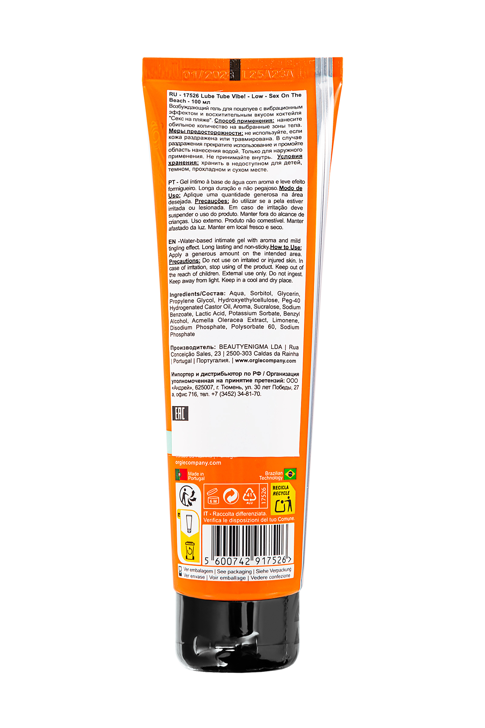 Позвольте себе насладиться незабываемыми моментами с гелем-лубрикантом с легким эффектом вибрации для интимных поцелуев от Orgie, который обладает восхитительным вкусом и ароматом коктейля "Sex On The Beach". Этот продукт станет идеальным дополнением для ваших интимных игр, даря удовольствие и свежесть. Интимный гель-лубрикант с эффектом вибрации на водной основе с ароматом и вкусом популярного коктейля "Sex On The Beach" подарит вам и вашему партнеру неповторимые ощущения. Легкий и не липкий, этот гель обеспечивает длительное скольжение и легко смывается. Его богатый, насыщенный вкус идеально подходит для оральных ласк, добавляя страсти и романтики вашим интимным моментам. Приятная вибрация добавит новых ощущений во время близости. Безопасность и комфорт: Гель на водной основе безопасен для использования, не содержит агрессивных химикатов и подходит для всех типов кожи. Универсальность: Идеален для интимных поцелуев и оральных ласк, обеспечивая вкус, аромат и легкую вибрацию которые трудно забыть. Обеспечивает продолжительное увлажнение и скольжение, что делает его идеальным для длительных сессий. Нелипкая текстура: оставляет кожу гладкой и шелковистой, не создавая ощущения липкости. Легкость в очистке: легко смывается водой, не оставляя следов и не вызывая раздражения. Насыщенный вкус и аромат: реалистичный вкус и аромат коктейля "Sex On The Beach" без алкоголя, придающий вашим интимным моментам пикантности и свежести. Интимный гель с эффектом вибрации Lube Tube Vibe! Sex On The Beach от Orgie идеально подходит для тех, кто стремится добавить в свои отношения нотку экзотики и страсти. Этот гель создаст атмосферу расслабления и удовольствия, позволяя вам наслаждаться каждой минутой близости. Способ применения: Нанесите обильное количество геля на интимную зону. При необходимости можно повторить нанесение для усиления скольжения и вкусовых ощущений. Orgie – это не просто бренд интимной косметики, это бразильский гимн любви и наслаждению. Продукция Orgie, созданная с использованием натуральных афродизиаков и инновационных формул, пробуждает чувственность и дарит незабываемые ощущения как в интимной близости с партнером, так и в сольном путешествии к самопознанию. Orgie – это философия, призывающая ценить и исследовать все грани интимности, делая каждый момент незабываемым.