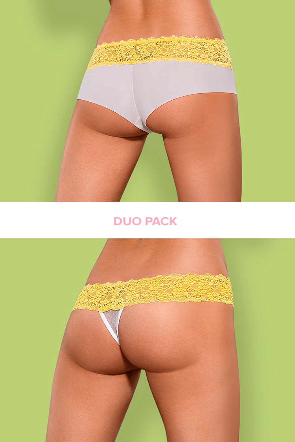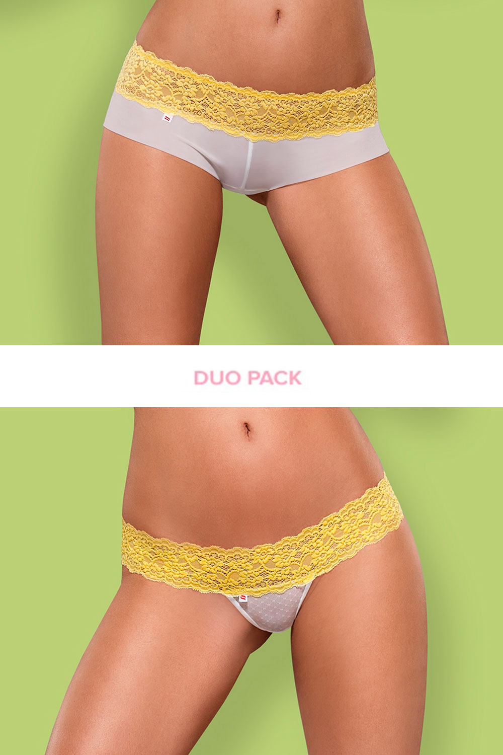 Пара белых с желтым кружевом трусиков Lacea: шорты и стринги.