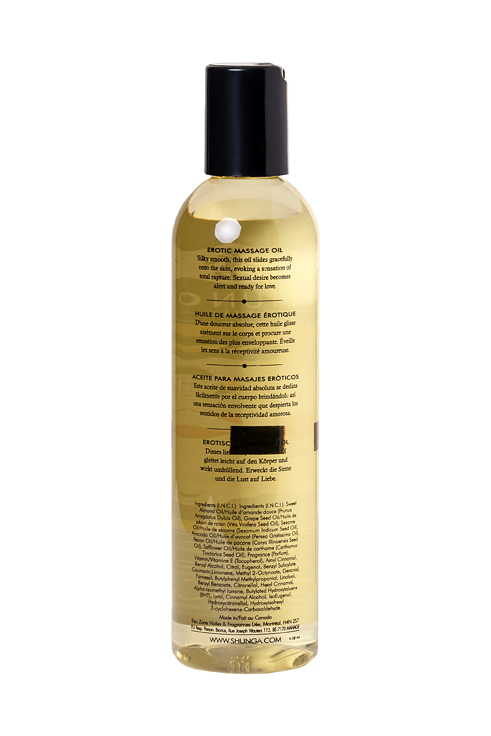 Мягкость и шелковистость этого масла с приятным скользящим эффектом на коже вызывает ощущение полного восторга. Сексуальное желание нарастает, и вы готовы к любви. Получите взаимное удовольствие от чувственного эротического массажа с использованием нашей эксклюзивной смеси масел холодного отжима, тщательно отобранных за свои стимулирующие и придающие энергию свойства.Масло легко скользит по коже, не оставляя жирных ощущений, в то время как различные экзотические ароматы поднимут ваши чувства до вершин возбуждения... Идеально подходит для того, чтобы насладиться расслабляющим массажем или сделать его, совместив с обволакивающими обольстительными ласками.Это на 100 % натуральное масло с упоительными ароматами, легко скользит по коже, не оставляя жирной пленки. Запах массажному маслу придают эфирные масла и отдушки, что в отличие от большей части другой продукции SHUNGA, ароматизированной вкусовыми добавками, делает его НЕСЪЕДОБНЫМ.Изготовлено из 100% натуральных масел холодного отжима. Не оставляет жирных пятен.Витамин Е (Антиоксидант).Не закупоривает поры кожи.Не содержит минеральных или животных масел.Применение: налейте небольшое количество на ладонь и разогрейте масло в ладонях, чтобы оно приобрело температуру тела. При желании вы можете нагреть масло в горячей воде для более горячего массажа.Для полного массажа тела. Избегать контакта с интимными зонами. Обратите внимание на то, что данное массажное масло ароматизировано эфирными маслами и отдушками, а, следовательно, не съедобно.Не рекомендуется в качестве персонального лубриканта.