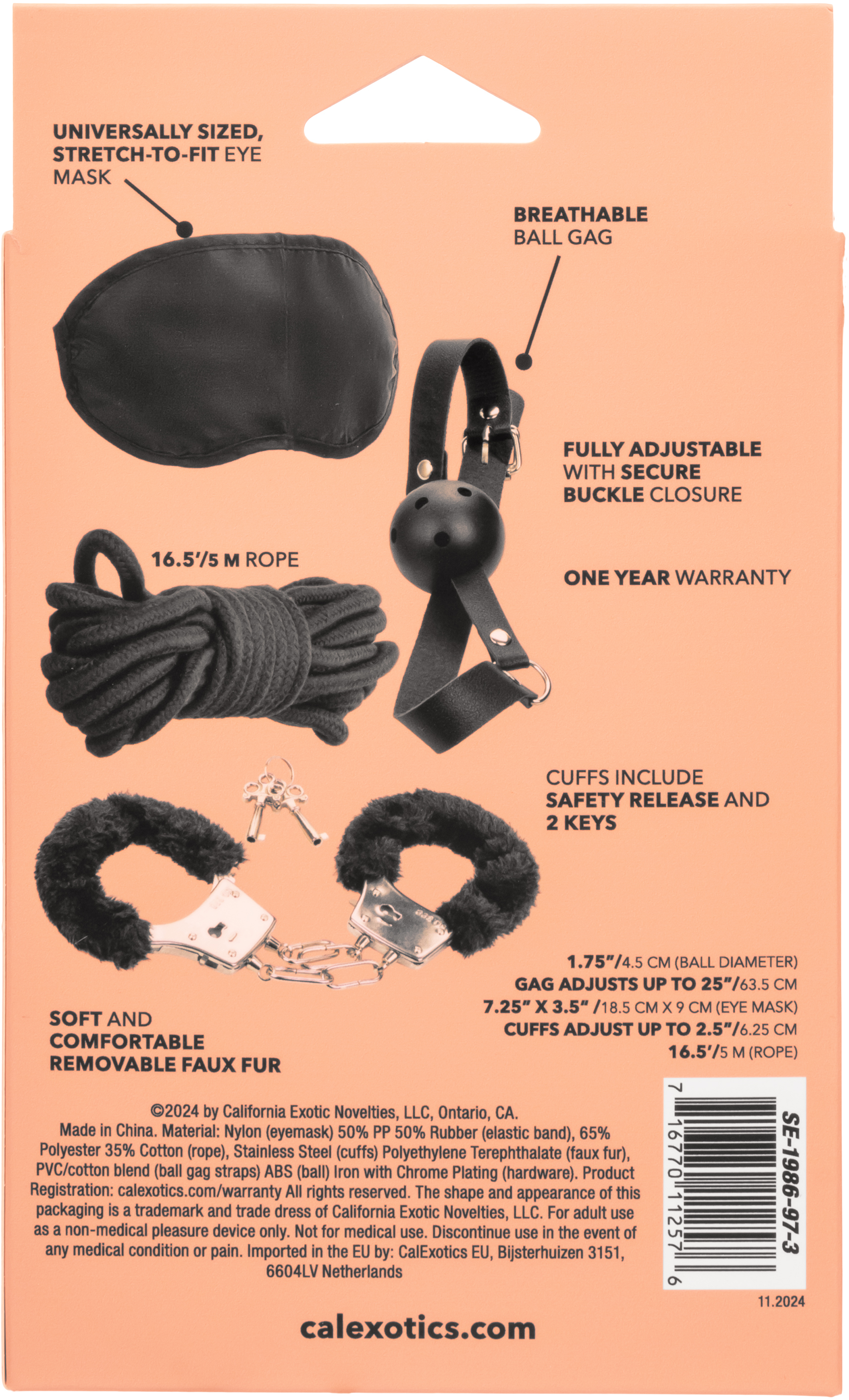 Материал набора ПВХ (передняя часть маски) Полиэстер (задняя часть маски) 50% ПП, 50% резина (резинка) 65% полиэстер, 35% хлопок (веревка) Нержавеющая сталь (манжеты) Полиэтилентерефталат (искусственный мех) Смесь ПВХ/хлопка (ремни для кляпа) АБС (шарики) Железо с хромированным покрытием