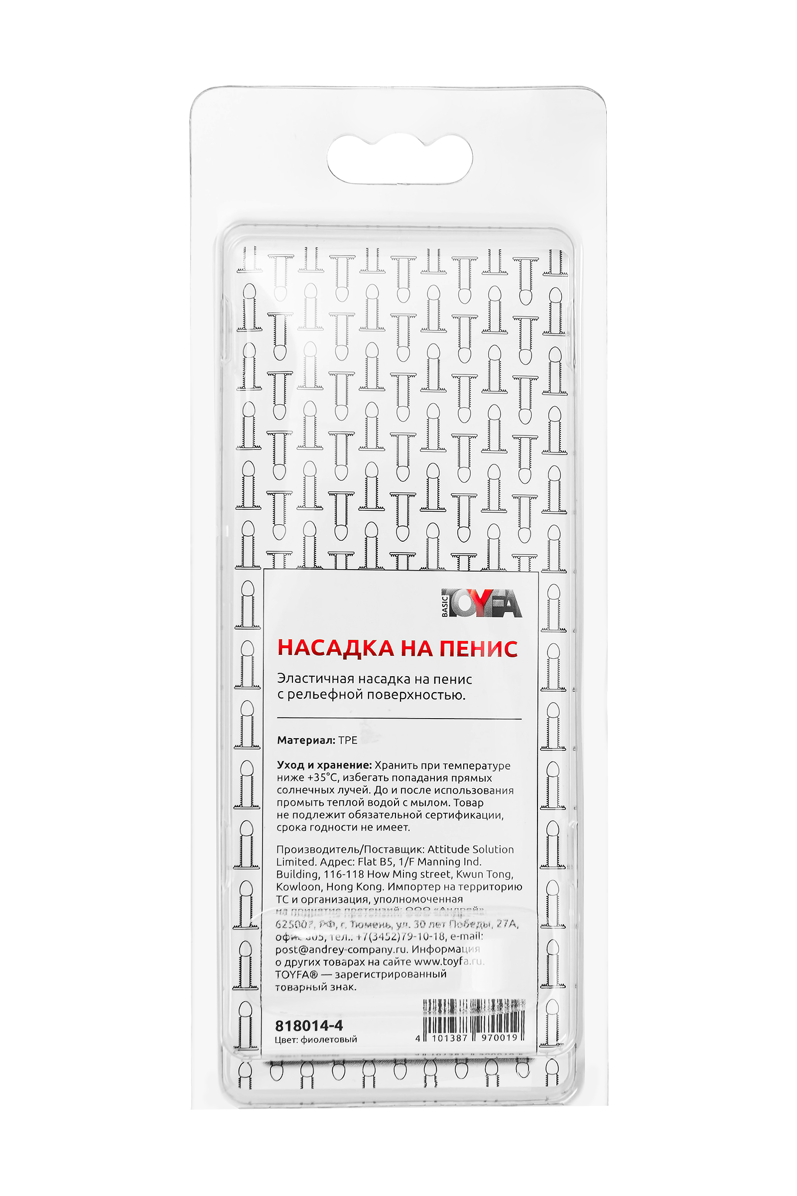 Насадка на пенис рельефная TOYFA Basic, TPE, фиолетовый, 12 см
