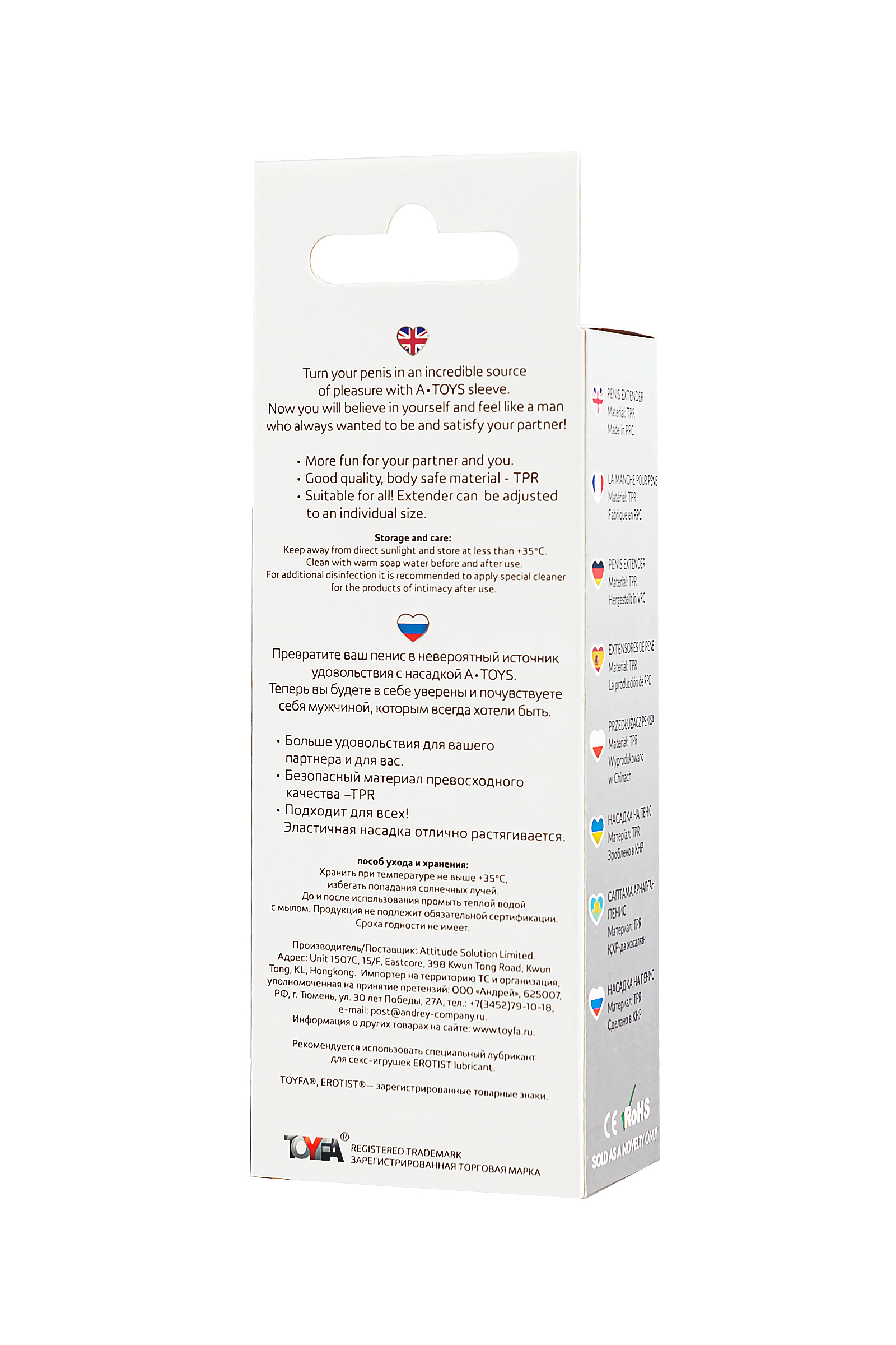 Превратите ваш пенис в невероятный источник удовольствия с насадками A-Toys. Теперь вы будете в себе уверены и почувствуете себя мужчиной, которым всегда хотели быть и удовлетворить своего партнера!• Гарантированное и мгновенное увеличение пенисабез операций и таблеток!• Больше удовольствия для вашего партнера и для вас.• Превосходный, безопасный материал –TPR.•Подходит для всех! Эластичная насадка отлично растягивается.