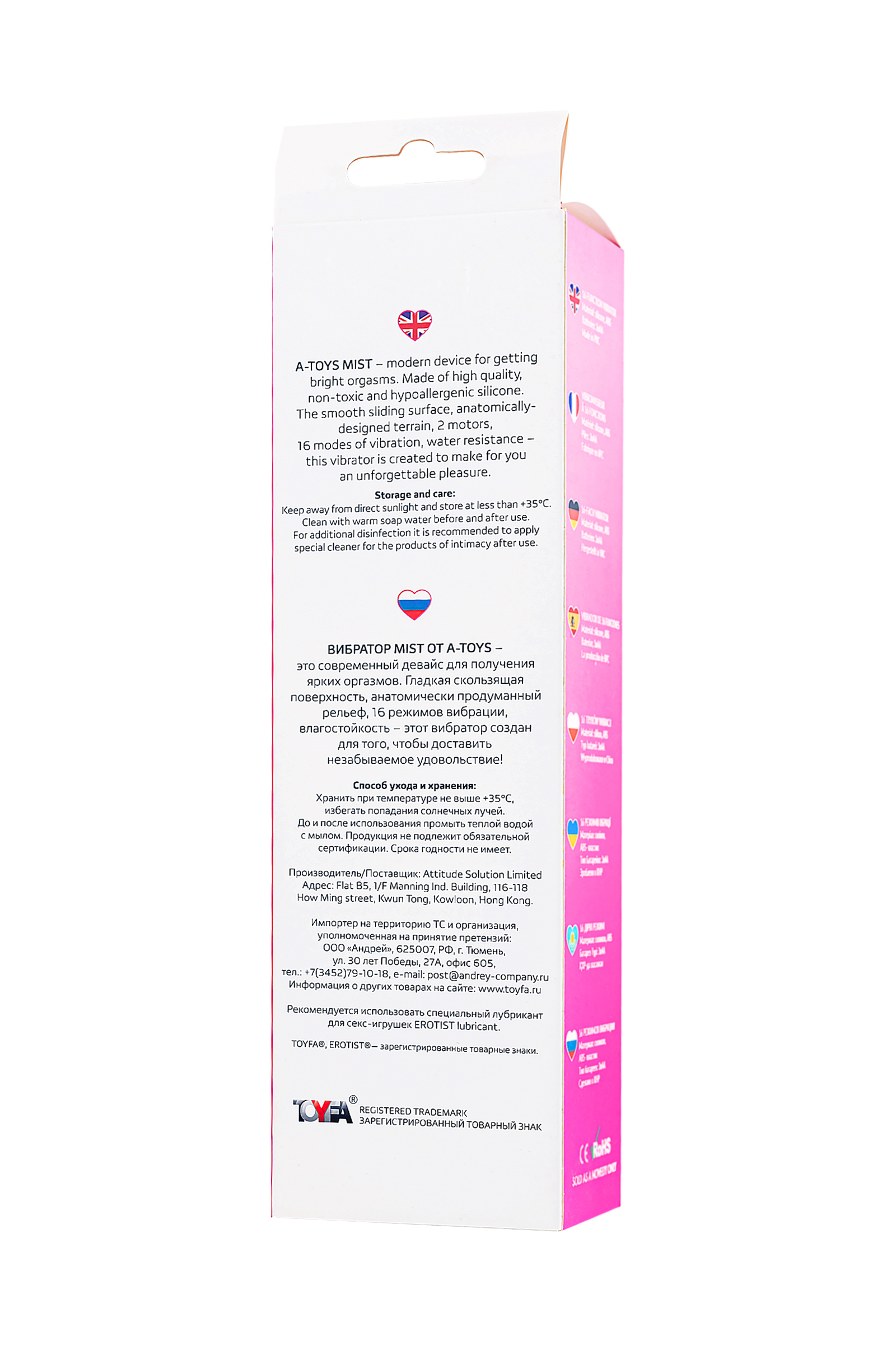 Вибратор Mist от A-Toys – это современный девайс для получения ярких оргазмов. Гладкая скользящая поверхность, анатомически продуманный рельеф, 16 режимов вибрации, влагостойкость – этот вибратор создан для того, чтобы доставить незабываемое удовольствие!