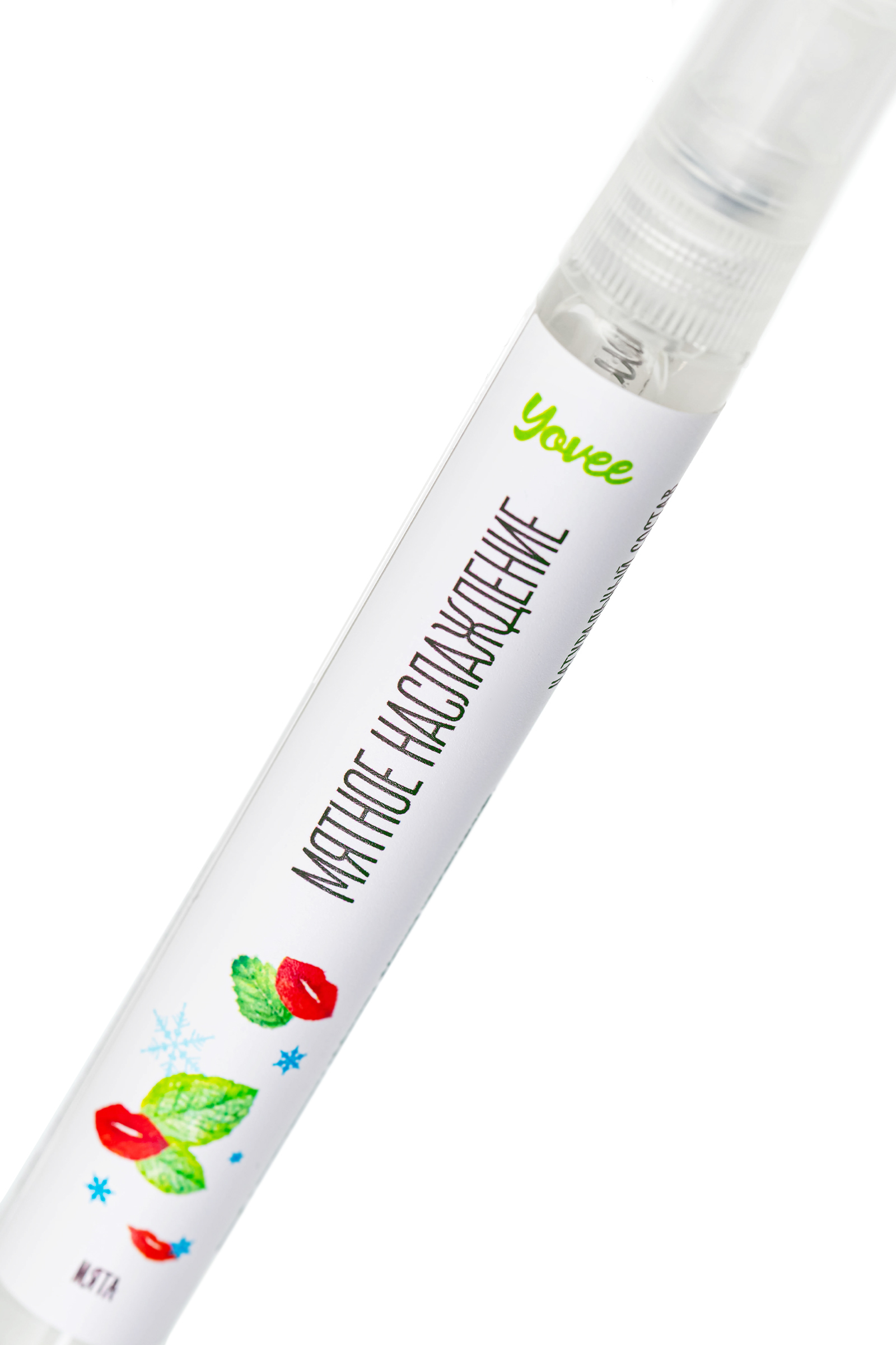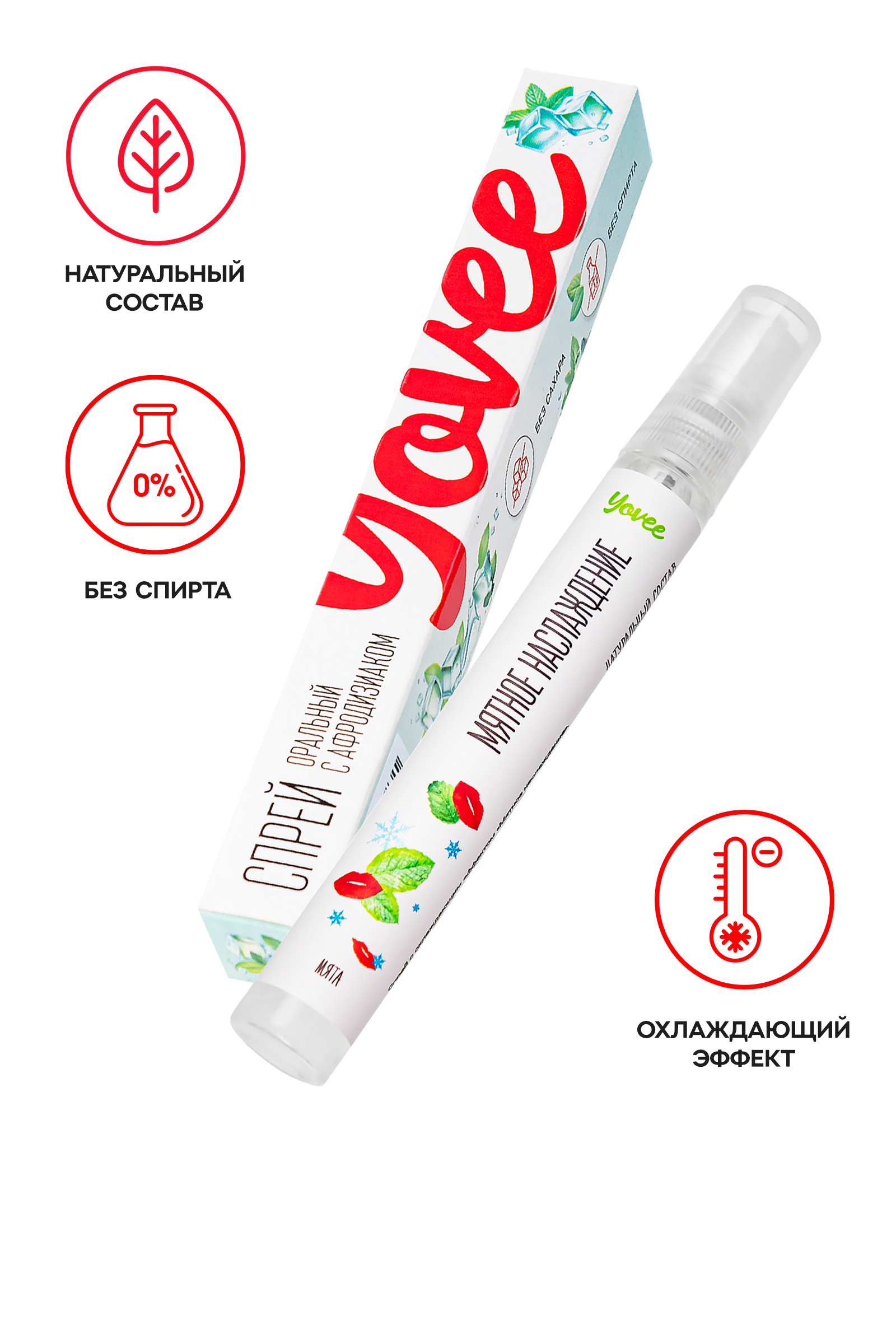 Обладая восхитительным мягким мятным вкусом и приятным охлаждающим эффектом спрей Yovee «Мятное наслаждение» усиливает удовольствие от секса и добавляет в интимную игру пикантные ноты.Применение спрея притупляет рвотный рефлекс и помогает освоить технику "глубокая глотка". Также спрей можно использовать для усиления чувствительности нервных окончаний сосков. Под воздействием активных компонентов восприимчивость эрогенных зон станет выше, а ласки еще более приятными.Распылять средство нужно непосредственно перед оральным сексом. Длительность эффекта зависит от количества нанесенного спрея.Применение: встряхните, распылите 2-3 дозы и подождите несколько секунд, чтобы почувствовать эффект.Освежает дыханиеУсиливает слюноотделениеОказывает охлаждающее и возбуждающее воздействиеНейтрализует рвотный рефлекс, помогает применить технику "глубокая глотка"Дарит новые ощущенияАктивные ингредиенты:Ментол - основной компонент эфирного масла, содержащегося в листьях мяты перечной. Избирательно раздражая холодовые рецепторы, вызывает ощущение холода, жжения, покалывания с последующим небольшим понижением чувствительности.Эфирное масло эвкалипта - афродизиак мягкого действия. Повышает сексуальную энергию, вселяет уверенность, придает силы, восстанавливает утраченные силы. Благодаря свойству эвкалиптового масла подавлять канцерогенные оральные бактерии, его часто используют в средствах для освежения дыхания и оздоровления полости рта.