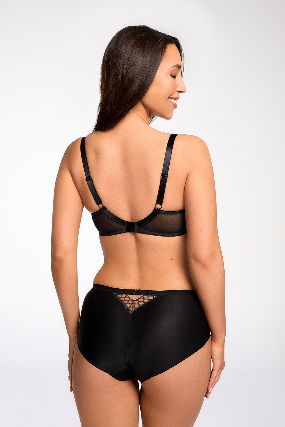 Черные трусы из коллекции Harmonious Vibrations. Нежные и женственные трусики с чуть завышенной талией. Изготовлены из полупрозрачной тонкой сетки, украшены красивыми сетчатыми вставками спереди, что придает им изысканный вид. Ножки отделаны тесьмой, которая сшита по технологии плоского шва, обеспечивая максимальный комфорт при ношении.