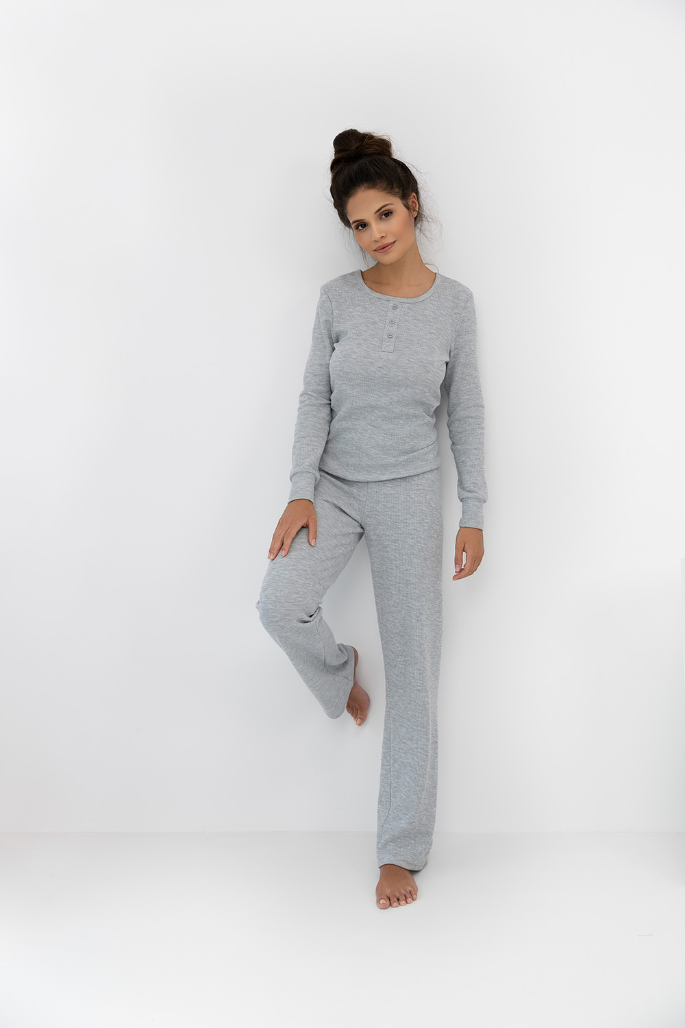 Пижама Jade серого цвета в рубчик состоит из прямых брюк и лонгслива с длинными рукавами. Круглый вырез горловины, воротник на кулиске. Идеальный вариант не только для сна, но и для домашнего отдыха.