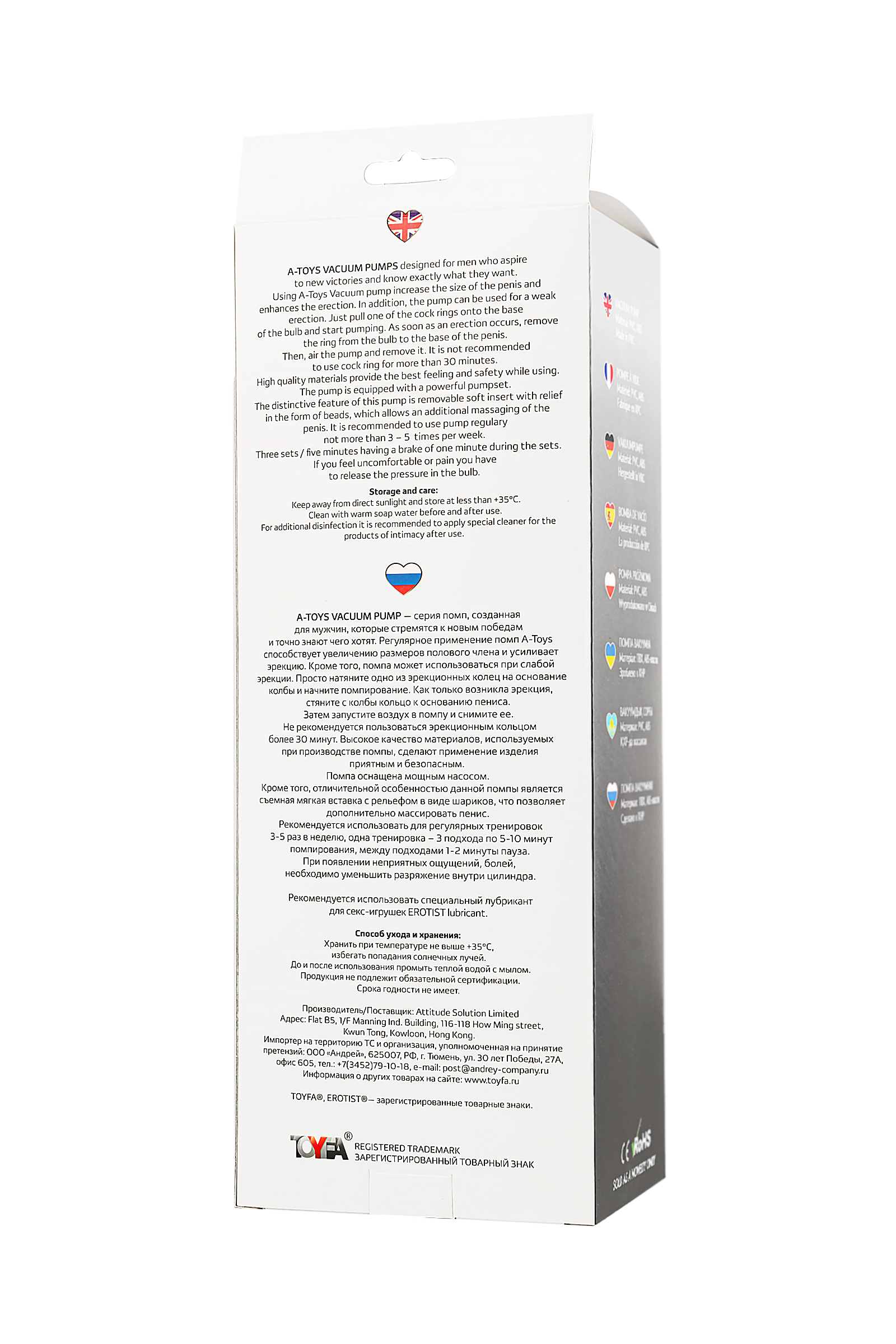 A-Toys Vacuum pump — серия помп, созданная для мужчин, которые стремятся к новым победам и точно знают чего хотя. Регулярное применение помп Atoys способствует увеличению размеров полового члена и усиливает эрекцию. Высокое качество материалов, используемых при производстве помпы, сделают применение изделия приятным и безопасным. Помпа оснащена мощным насосом. Кроме того, отличительной особенностью данной помпы является съемная мягкой вставка с рельефом в виде шариков, что позволяет дополнительно массировать пенис.Мин. диаметр 5, макс.диаметр 5,6