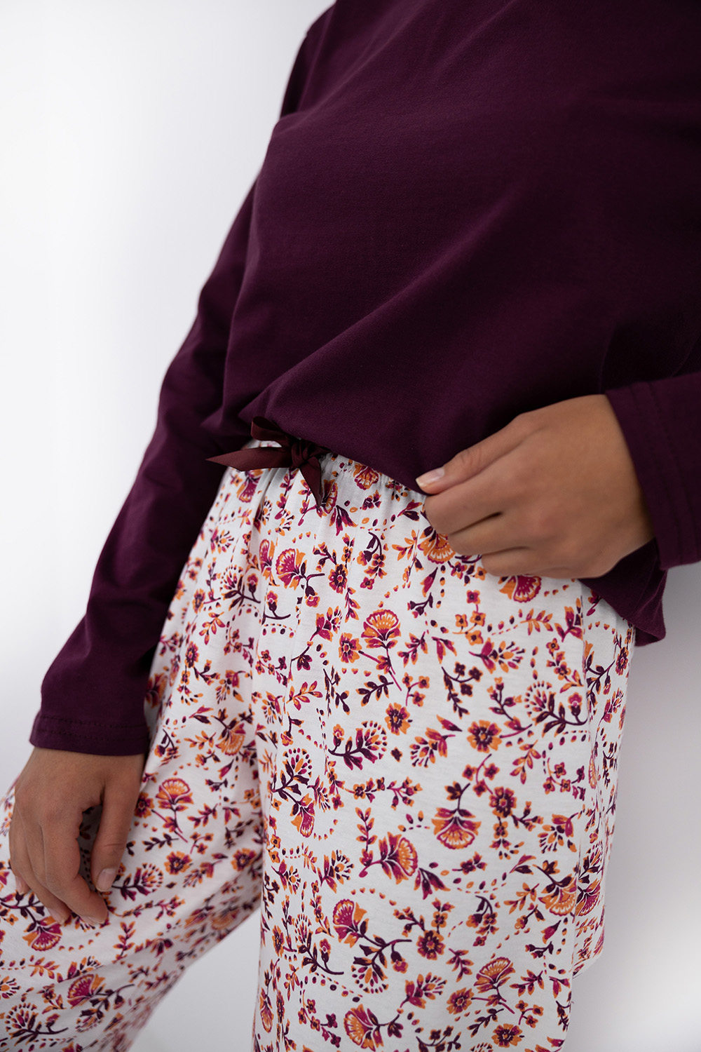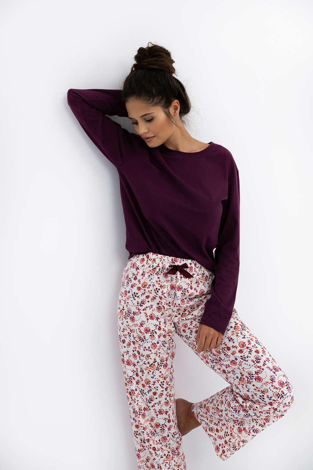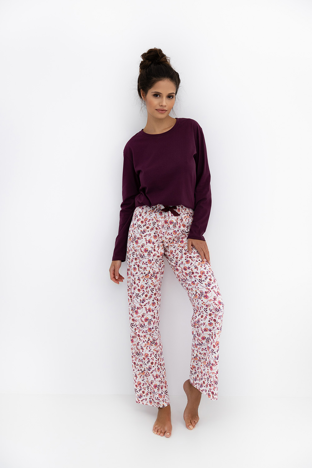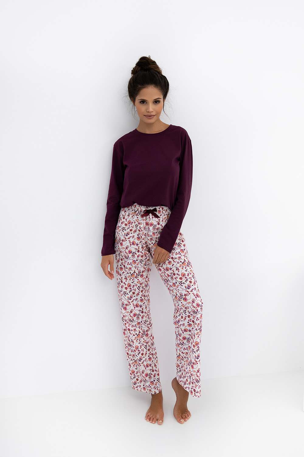 Пижама Heidi состоит из прямых брюк белого цвета с цветочным принтом и однотонного лонгслива с длинными рукавами. Брюки на широкой резинке, декорированы контрастным бантиком. Идеальный вариант не только для сна, но и для домашнего отдыха.