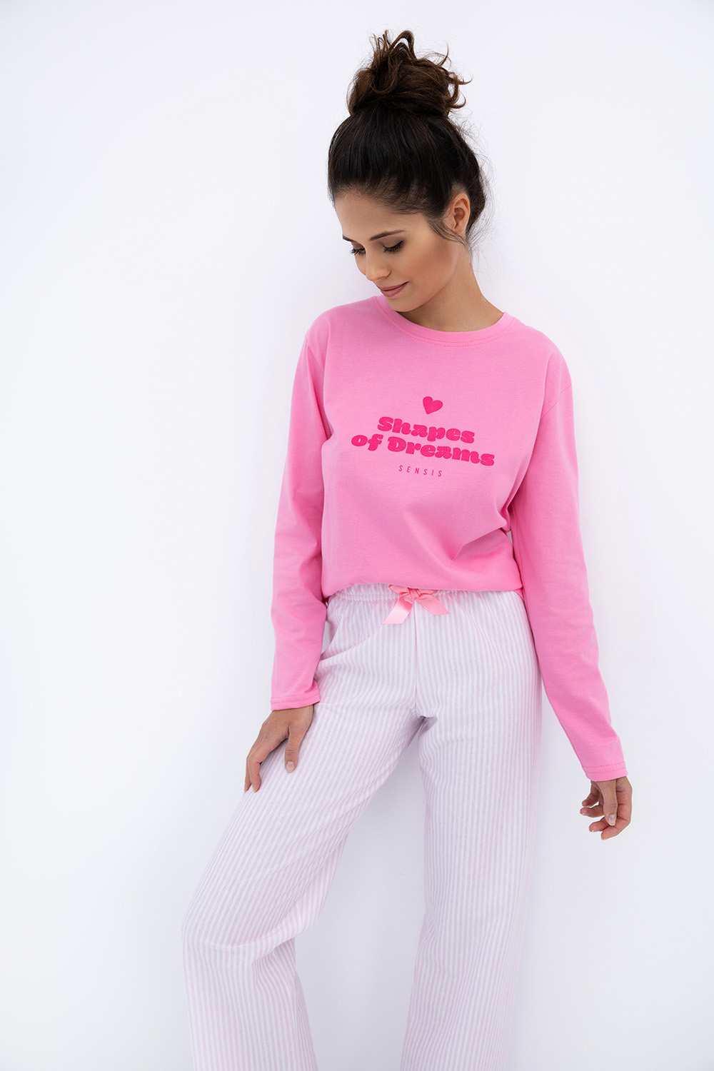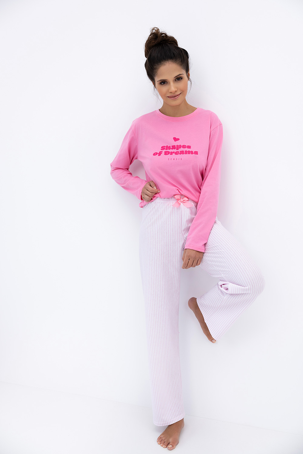 Повседневная пижама Malaya состоит из свободных брюк в полоску и однотонного лонгслива с милой надписью на груди. Брюки декорированы контрастным бантиком на поясе. Лонгслив прямого кроя с длинными рукавами. Идеальный вариант не только для сна, но и для домашнего отдыха.