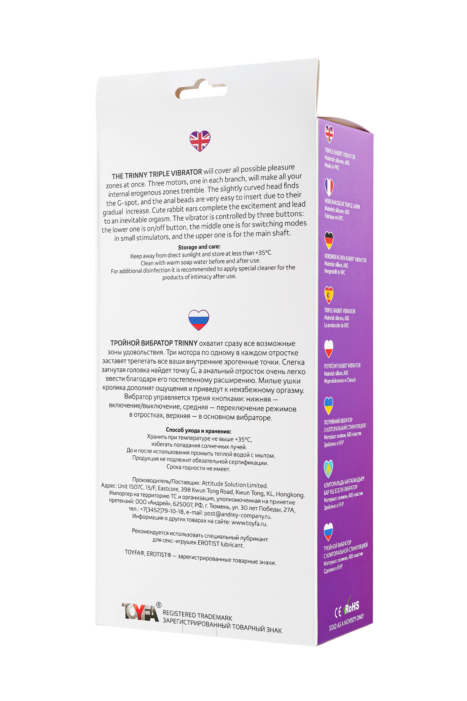 Тройной вибратор Trinny охватит сразу все возможные зоны удовольствия. Два мотора заставят трепетать все ваши внутренние эрогенные точки. Слегка загнутая головка найдет точку G, а анальный отросток очень легко ввести благодаря его постепенному расширению. Милые ушки кролика дополнят ощущения и приведут к неизбежному оргазму. Вибратор управляется тремя кнопками: нижняя - включение/выключение, средняя - переключение режимов в отростках, верхняя - в основном вибраторе.Материал: Силикон10 режимов вибрацииДлина основного ствола 13 смДлина кролика 7 смДлина анального стимулятора 11 см