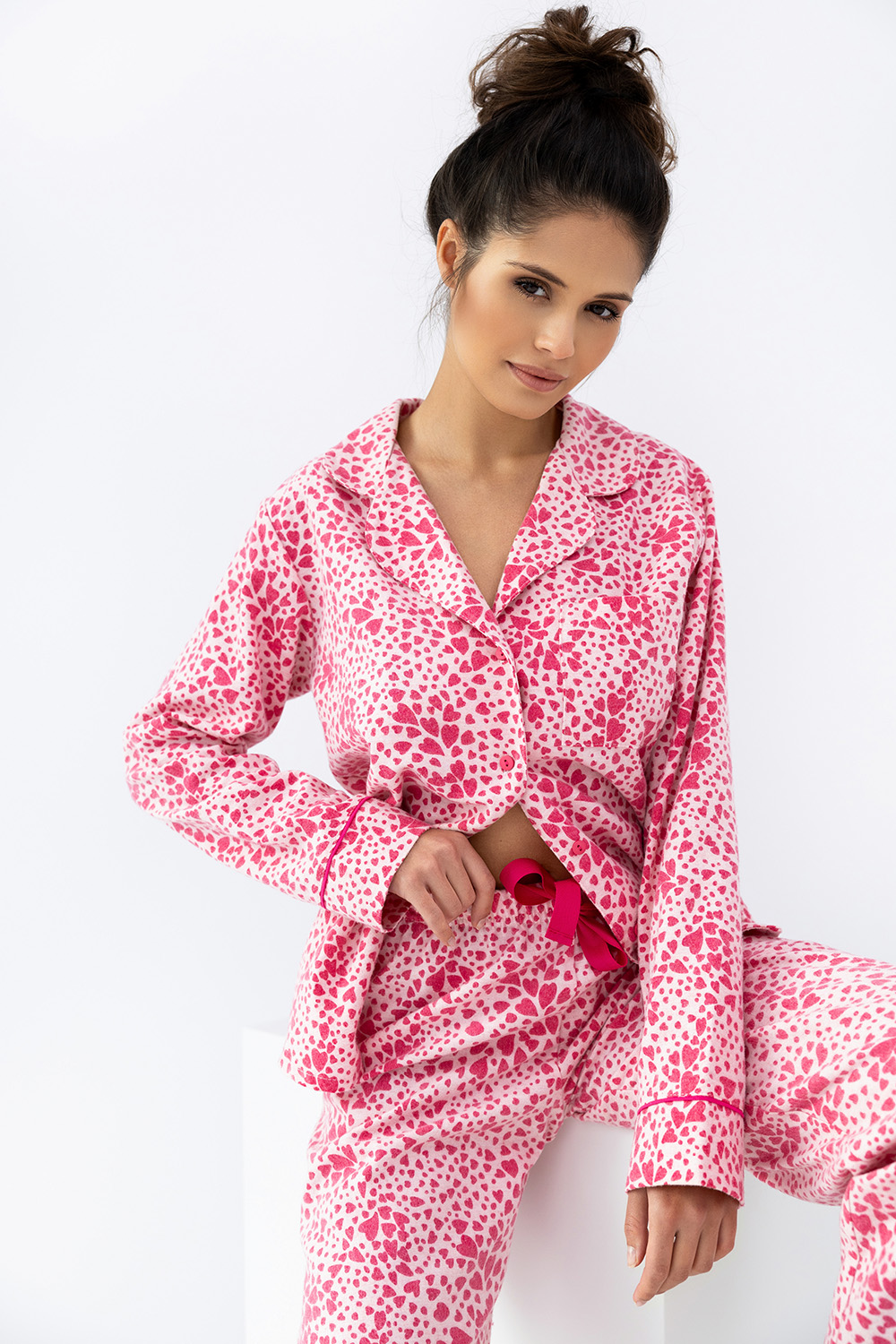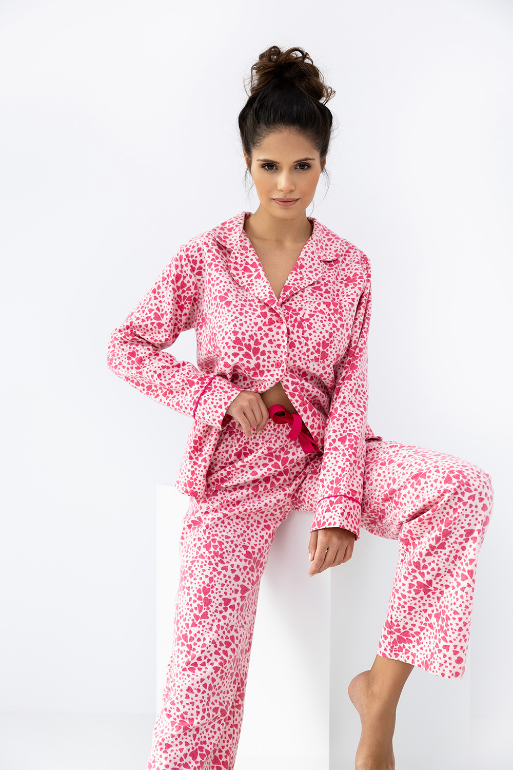 Романтичный домашний комплект Giuliana состоит из прямых брюк и рубашки. Брюки на широкой резинке, декорированы контрастным бантиком на поясе. Рукава оформлены манжетами. Материал изделия выполнен с интересным принтом сердечки. Идеальный вариант не только для сна, но и для домашнего отдыха.