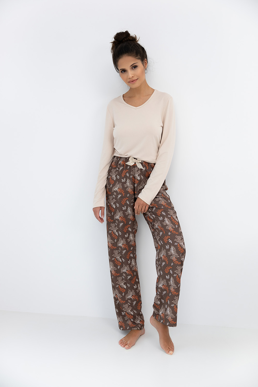 Повседневная пижама Shelby с прямыми брюками и однотонным лонгсливом. Лонгслив с v-образным вырезом и с длинными рукавами. Брюки с растительным принтом принтом и контрастным бантиком на поясе. Идеальный вариант не только для сна, но и для домашнего отдыха. Состав брюк: вискоза 100%.