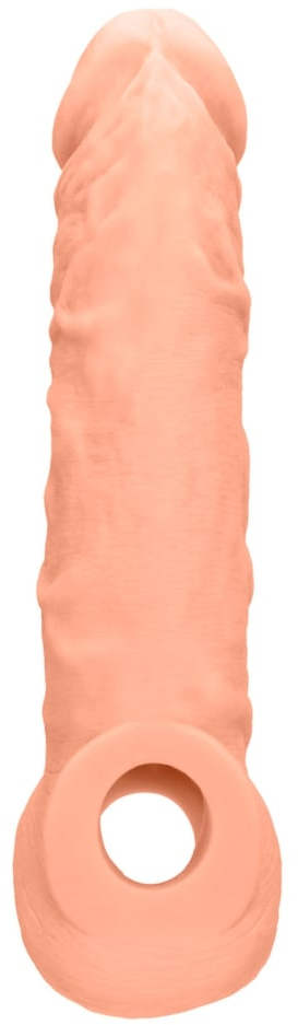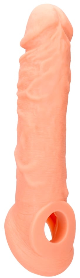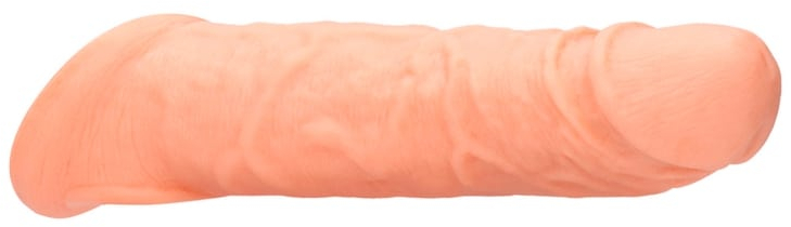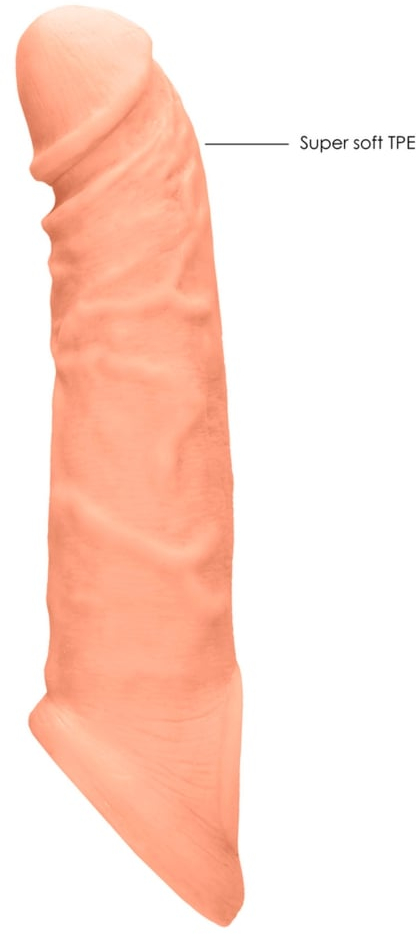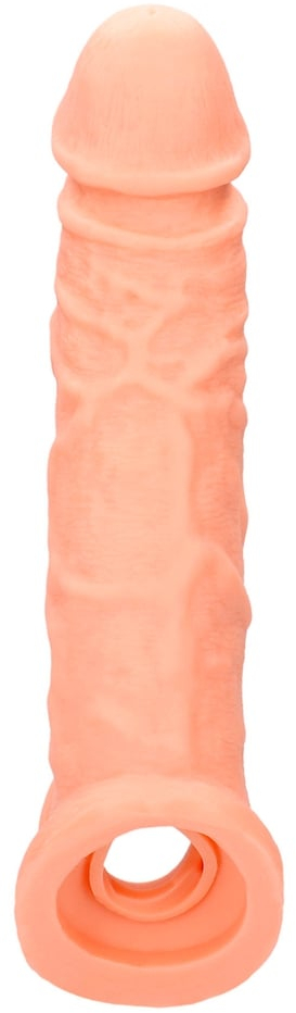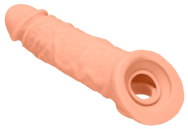 Насадка закрытого типа для увеличения длины и обхвата полового члена «вторая кожа» с кольцом для фиксации на мошонке. Она имеет реалистичную форму с ярко выраженной головкой и рельефным покрытым венками телом для дополнительной стимуляции. Насадка сделана из мягкого ТПЕ без фталатов.