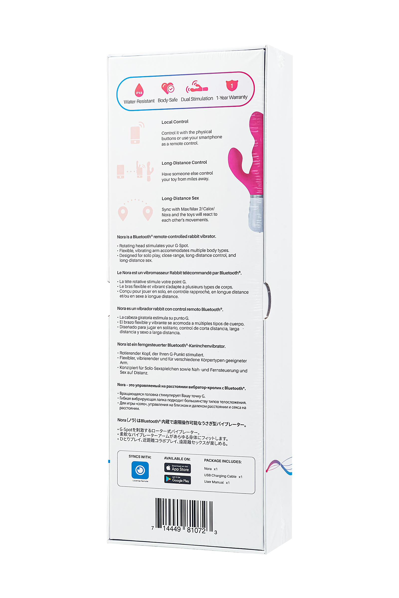 Откройте для себя удивительный мир наслаждения с вибратором-кроликом Nora от Lovense. Это самый мощный управляемый на расстоянии вибратор с двойной стимуляцией и функцией Bluetooth. Компания Lovense является одним из ведущих производителей секс-игрушек. Наслаждайтесь отдельным контролем над стимуляцией точки G и клитора, создавая неповторимые ощущения, которые удовлетворят ваши самые сокровенные желания.Nora обладает специально изогнутым стволом, который мягко стимулирует нужные точки, а глубокое вращение головки обеспечивает интенсивную стимуляцию точки G. Погружная часть вибратора - 12 см. Гибкая вибрирующая клиторальная лапка приспосабливается к разным типам телосложения, обеспечивая идеальное сочетание комфорта и удовольствия.Синхронизируйте Nora с другими игрушками Lovense, такими как Calor или Max 2, и наслаждайтесь интерактивным сексом на расстоянии. Управляйте игрушкой через приложение Lovense Remote, выбирая из неограниченного количества паттернов вибрации и синхронизируя ее с музыкой. Активируйте вибрацию звуком или настройте уровень мощности, исходя из своих индивидуальных предпочтений.отличное подключение в сочетании с множеством функцийнеограниченное количество паттерновуправление с близкого расстояниябиблиотека с более чем 5000 паттерновсинхронизация с музыкой. Nora выполнена из 100% безопасного для тела силикона, обладает шелковистой поверхностью – особенный комфорт в ваших руках. Яркий сочный розовый цвет – визитка игрушек от Lovense. С помощью магнитной USB-зарядки вы можете легко подзарядить игрушку, кроме того, вы устанете первой – длительное наслаждение без подзарядки до 245 минут! В режиме ожидания Nora сохраняет заряд до 120 часов!Освободите свои фантазии и насладитесь уникальным комфортом и стимуляцией с вибратором-кроликом Nora от Lovense. Управляйте на расстоянии, создавайте новые интимные связи и погружайтесь в мир бесконечного удовольствия.Что в комплекте:Вибратор-кролик Nora c Bluetooth USB кабель для подзарядкиРуководство пользователя