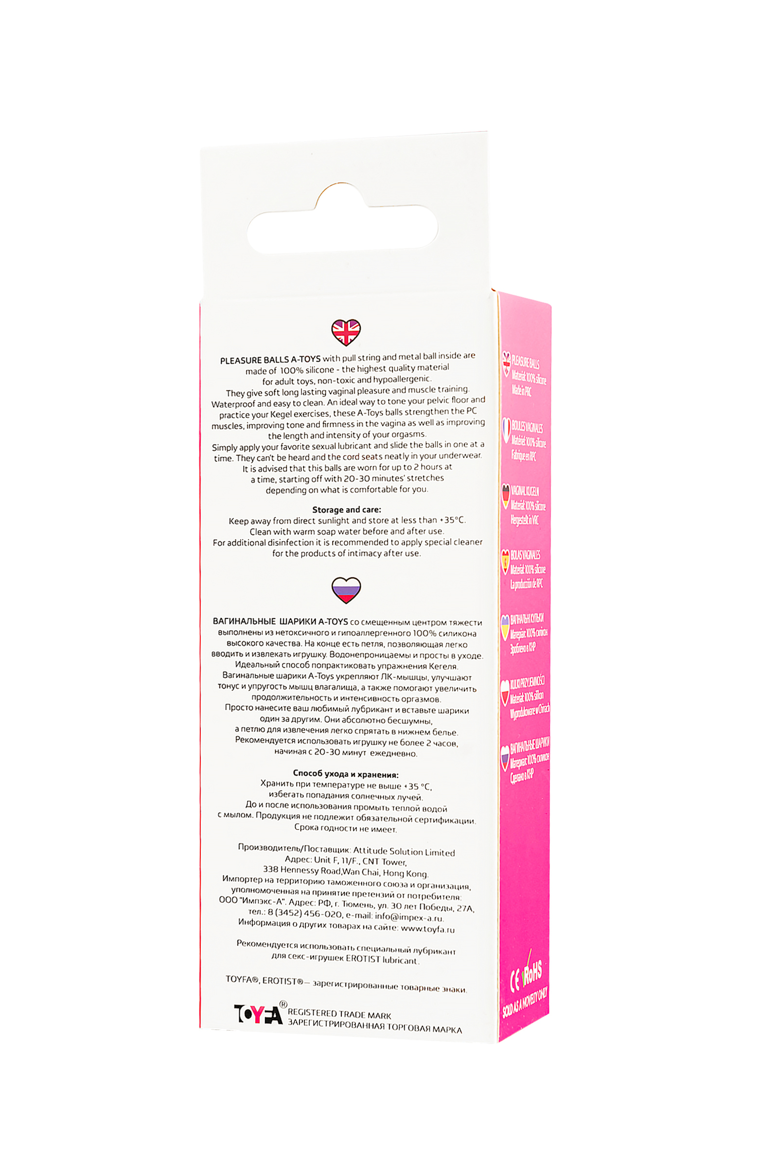 Вагинальные шарики A-Toys Flov со смещенным центром тяжести выполнены из нетоксичного и гипоаллергенного 100% силикона высокого качества. На конце есть петля, позволяющая легко вводить и извлекать игрушку. Водонепроницаемы и просты в уходе. Идеальный способ попрактиковать упражнения Кегеля. Вагинальные шарики А-Toys укрепляют ЛК-мышцы, улучшают тонус и упругость мышц влагалища, а также помогают увеличить продолжительность и интенсивность оргазмов.Просто нанесите ваш любимый лубрикант и вставьте шарики один за другим. Они абсолютно бесшумны, а петлю для извлечения легко спрятать в нижнем белье. Рекомендуется использовать игрушку не более 2 часов, начиная с 20-30 минут ежедневно.