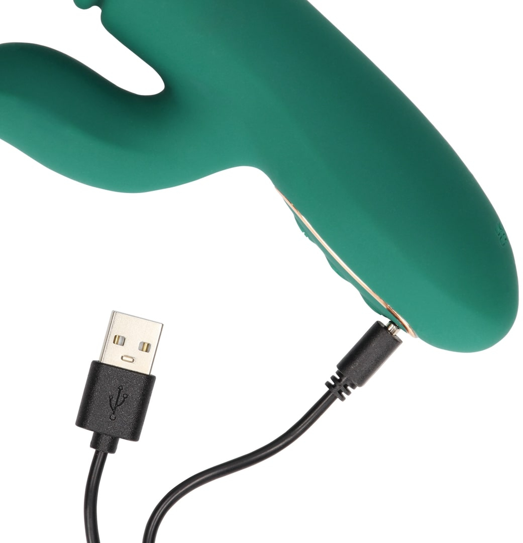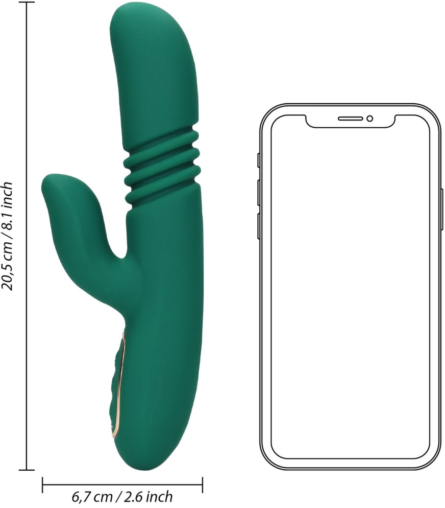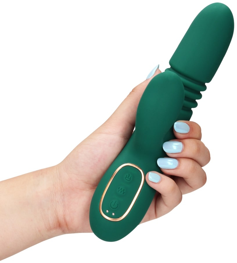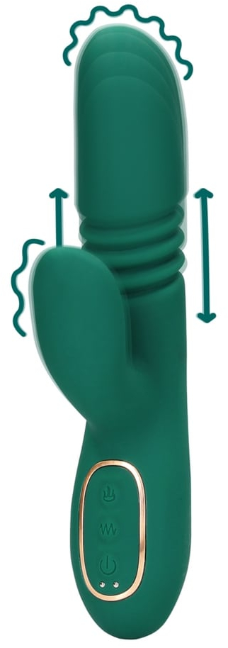 Thrusting Rabbit – роскошный вибромассажер с функцией «поступательное движение» и функцией нагрева до приятной температуры в 42°C. Особенностью этой линейки является особый мягкий и нежный силикон высшего качества, который создаёт уникальные ощущения от прикосновения и особым образом передает телу вибрации. Два самостоятельных мотора обеспечивают отдельно управление различными функциями вибрации и функциями пенетрации.