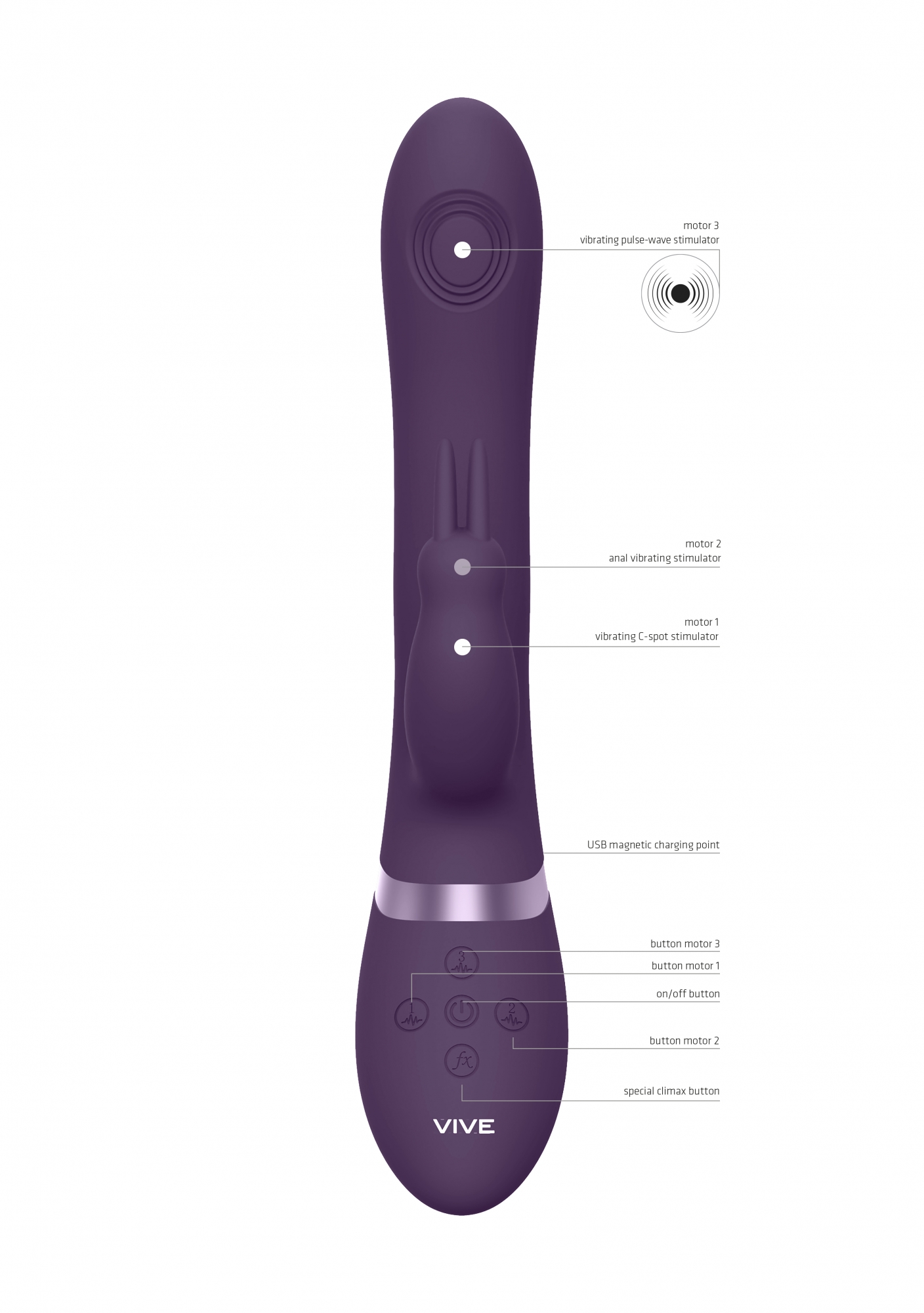 Изготовлено изделие из шелковистого медицинского (гипоаллергенного) силикона и как большинство моделей линейки VIVE имеет кнопку мгновенного оргазма, запуская все моторы на максимум одним касанием.