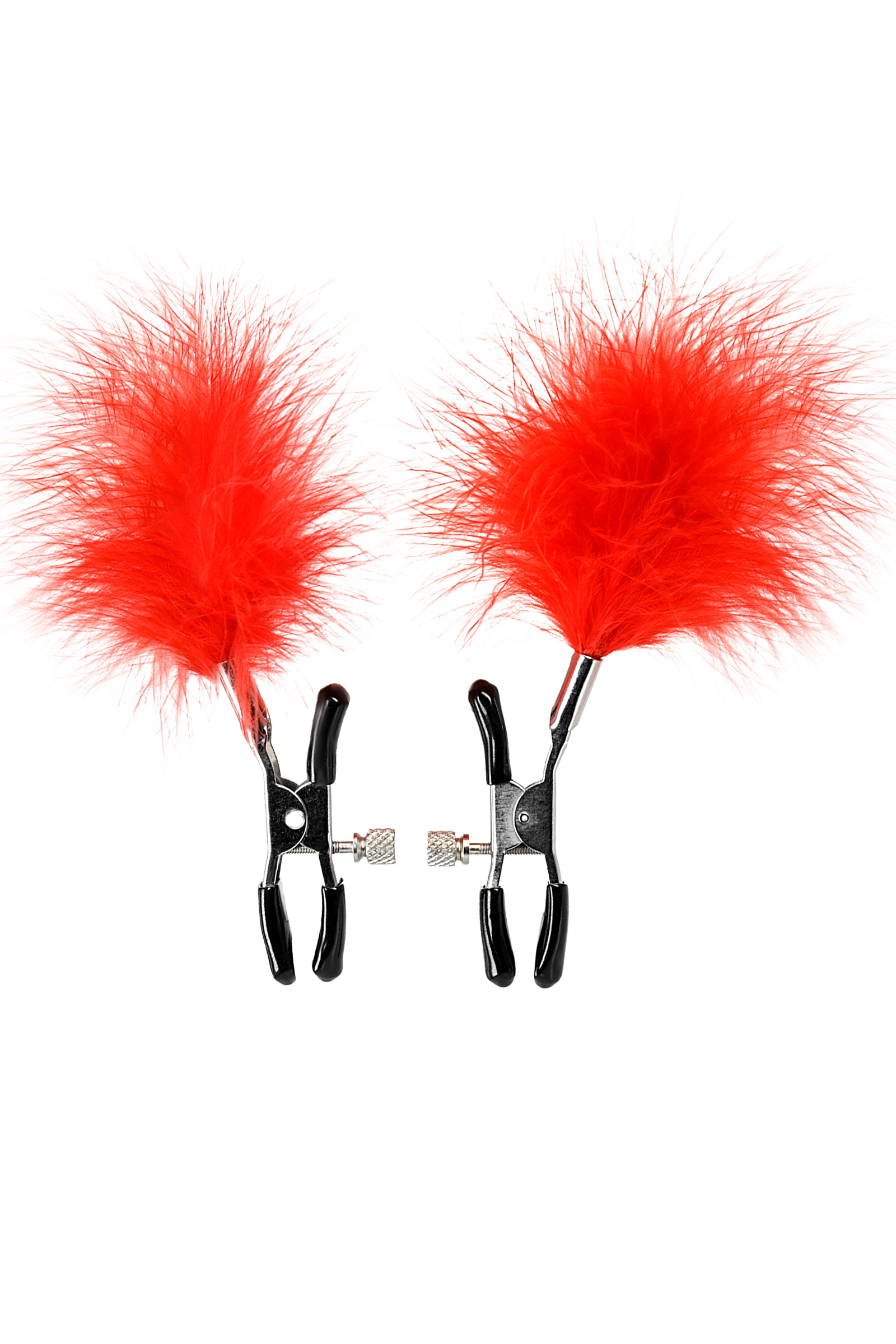 Пожалуй, самые милые из всех зажимов - украшенные перьями. Они стимулируют не только сжатием сосков, но и щекочут грудь. Сдавливание регулируется болтиком и может быть усилено или уменьшено во время интимной игры. Покрытие на концах зажимов защищает нежную кожу.